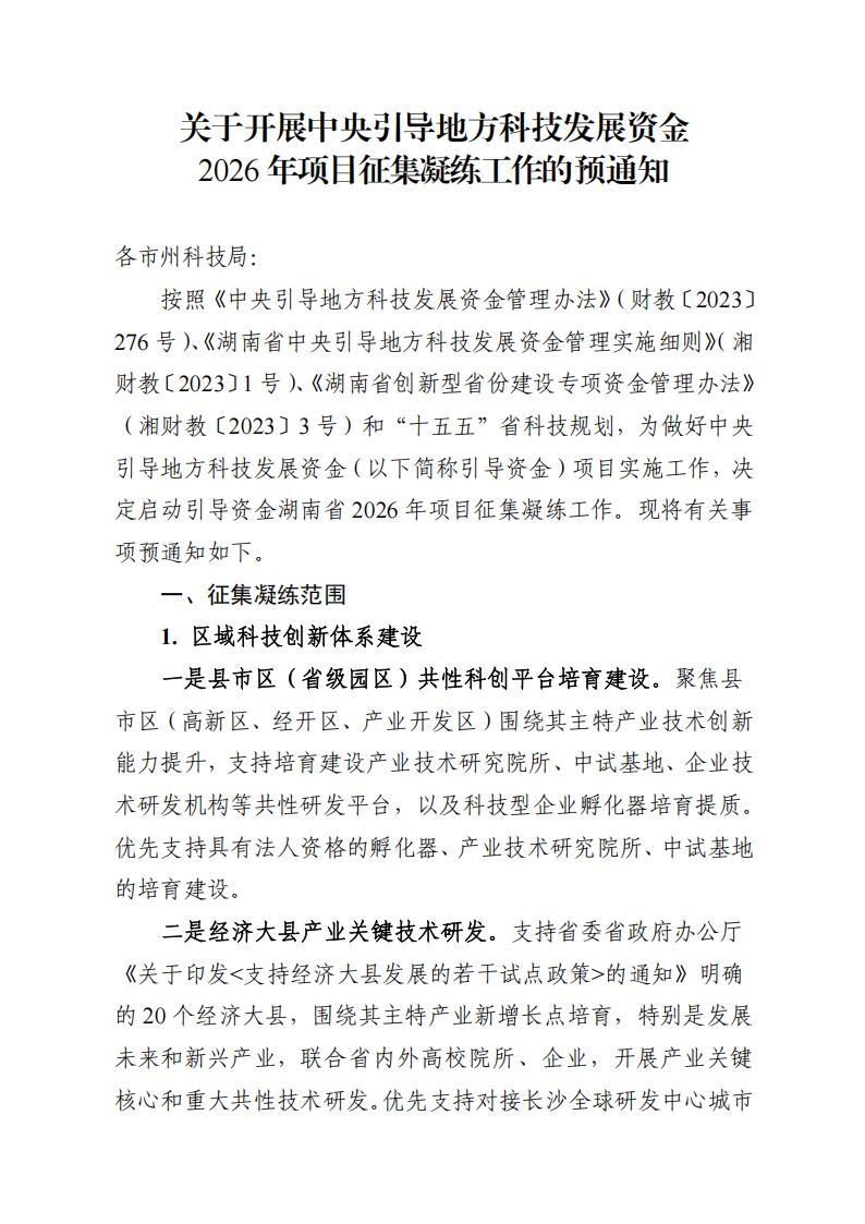 关于开展中央引导地方科技发展资金 2026年项目征集凝练工作的预通知